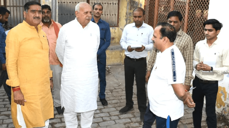 कैबिनेट मंत्री सूर्य प्रताप साही और विधायक से बात करते हुए