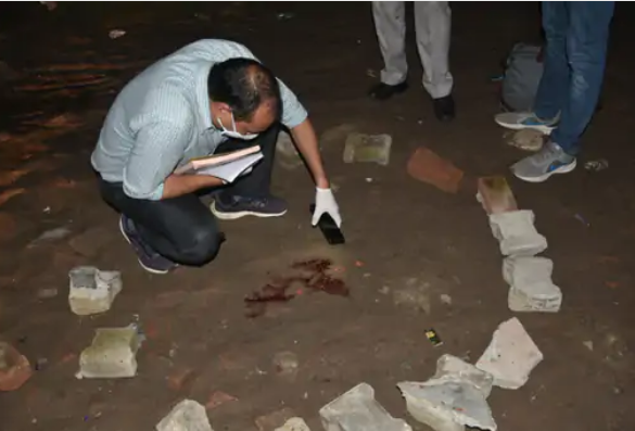 घटना स्थल पर पड़े खून से साक्ष्य जुटाने में जुटा फॉरेंसिक टीम का सदस्य