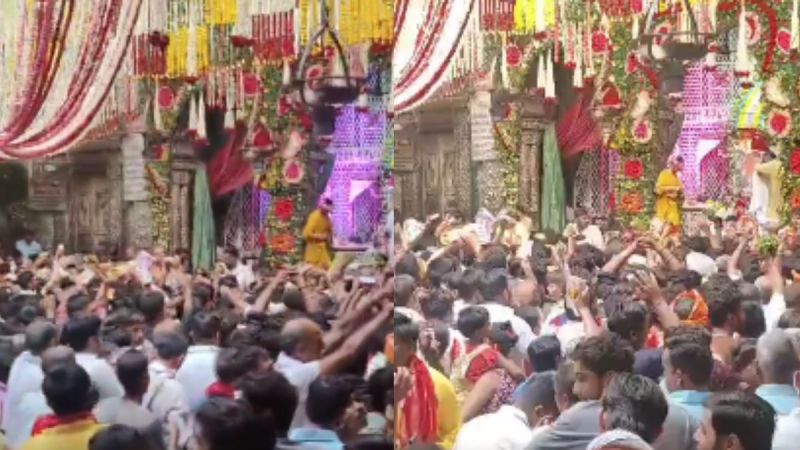 Hariyali Teej: हरियाली तीज के पावन पर्व पर आज वृंदावन के प्रसिद्ध बांके बिहारी मंदिर में सैकड़ों भक्तों का तांता लगा हुआ है। इस अवसर पर बांके बिहारी मंदिर के अंदर ठाकुर बांके बिहारी जी को स्वर्ण और रजत के मनमोहक हिंडोले पर विराजमान किया गया। इसके बाद भक्त भगवान कृष्ण और मां राधा के दर्शन कर आशीर्वाद ले रहे हैं।
