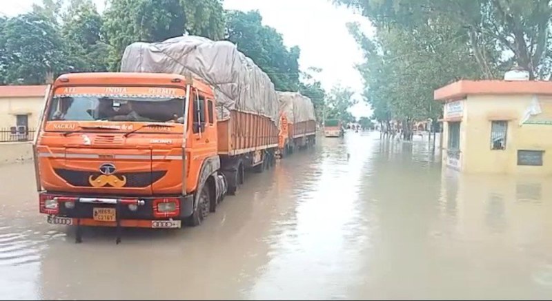 बीते कई दिन से हो रही तेज बारिश के चलते अनाज मंडी पूरी तरह से बारिश के पानी से लबालब हो गई है।