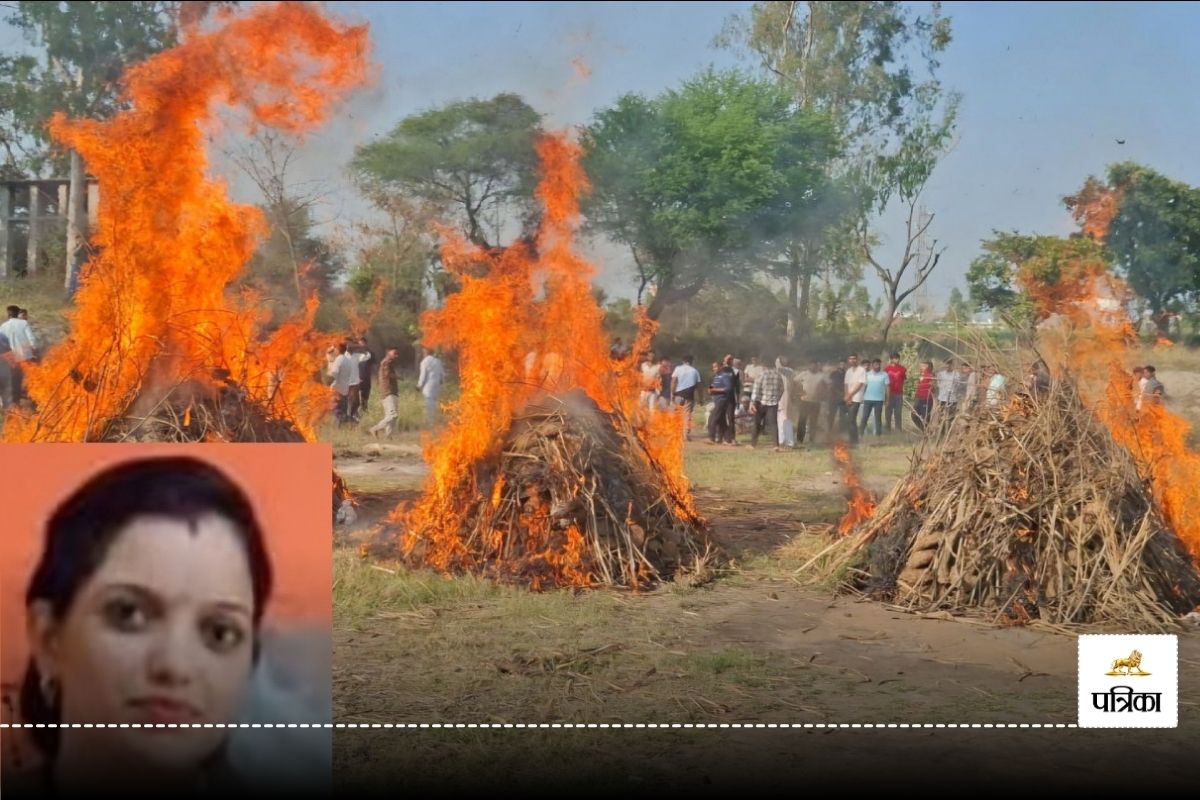 पीछे तीनों बच्चों की जलती चिताएं और नीचे मां नेहा का फाइल फोटो