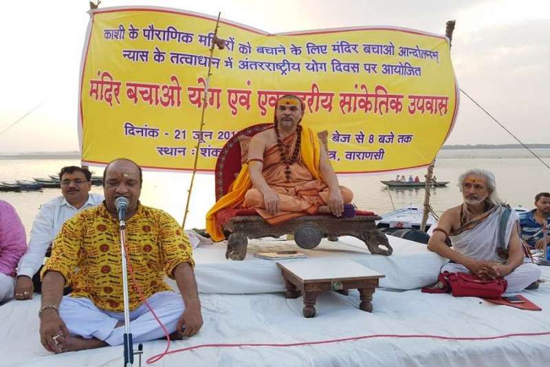 वाराणसी. अंतर्राष्ट्रीय योग दिवस पर जहां बनारस सहित पूरी दुनिया में लोग योगाभ्यास कर रहे थे, वहीं काशी के शंकराचार्य घाट जहां नित्य प्रति बटुक योगाभ्यास, प्राणायाम और सूर्य नमस्कार करते हैं वहां ज्योतिष एवं शारदापीठाधीश्वर शंकराचार्य स्वरूपानंद के शिष्य श्री विद्या मठ के प्रभारी स्वामी अविमुक्तेश्वरानंद सांकेतिक उपवास पर बैठ गए। यह सांकेतिक उपवास काशी में टूट रहे मंदिरों और देव विग्रहों के विरोध में था। शंकराचार्य घाट पर गुरुवार को योग दिवस पर आयोजित कार्यक्रम को मंदिर बचाओ योग नाम दिया गया।