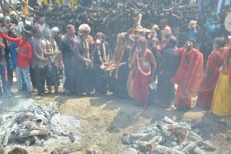 मणिकर्णिका घाट पर जलती चिताओं के बीच चिता भस्म की होली