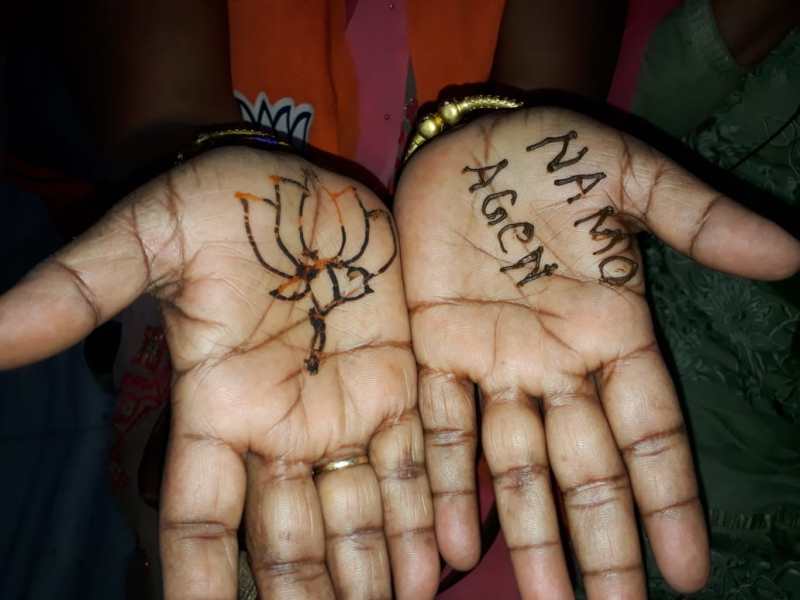 वाराणसी. राजनीतिक दल चुनाव में प्रचार करने का कोई भी मौका नहीं छोड़ते हैं। गुरुवार को पीएम नरेन्द्र मोदी के संसदीय क्षेत्र चुनाव प्रचार को लेकर अनोखा आयोजन किया गया। बीजेपी के महमूरंगज स्थित कार्यालय में कमल मेहंदी का आयोजन किया गया। महिलाओं ने मेहंदी से हाथ में कमल बनाया और नमो अगेन भी लिखवाया।