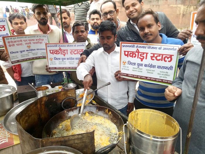 वाराणसी. प्रधानमंत्री नरेंद्र मोदी के रोजगार के नाम पर युवाओँ से पकौड़ा बेचने की सलाह और उसके बाद राज्यसभा में भजपा अध्यक्ष अमित शाह पकौड़ा बिक्री संबंधी पीएम के बयान के समर्थन के बाद बौखलाई कांग्रेस ने बुधवार को पीएम के संसदीय क्षेत्र वाराणसी और उनके प्रिय क्षेत्र अस्सी घाट पर विरोध स्वरूप लगाया ठेला, तला पकौड़ा और की उसकी बिक्री। युवा कांग्रेस के इस विरोध के अंदाज को काफी सराहा भी गया। लोगों की भीड़ लग गई थी पकौड़े के ठेले के पास। युवा कांग्रेस कार्यकर्ताओं ने इस मौके पर अस्सी घाट पर प्याज,आलू, गोभी और बैगन का पकौड़ा बनाया। साथ ही बेरोजगारी पत्र पर युवाओ से हस्ताक्षर कर प्रधानमंत्री कार्यालय को पोस्ट भी किया।
