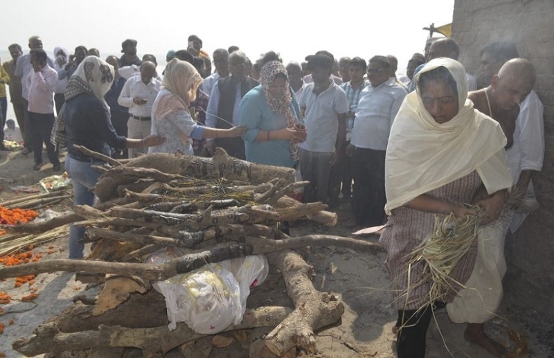 वाराणसी. पिता की अंतिम इच्छा थी कि मौत के बाद उनकी बेटी ही अंतिम संस्कार करें। गुरुवार को सुबह कैंसर की बीमारी से लड़ते हुए पिता की मौत हो गयी। चारों बेटियों ने अपने कंध पर शव को मणिकर्णिका घाट पहुंचाया और बड़ी बेटी ने मुखाग्रि देकर रस्म पूरी की। बेटियों ने दिखा दिया कि वह बेटों से कम नहीं होती है और अब समाज के रीति रिवाज को बदलने की जरूरत है।
