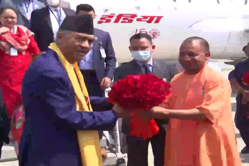 एयरपोर्ट पर नेपाल के पीएम देउबा का स्वागत करते सीएम योगी आदित्यनाथ