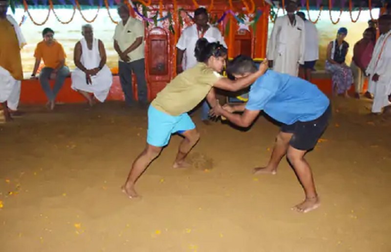 अखाड़े पर वार्षिक कुश्ती कौशल का प्रदर्शन