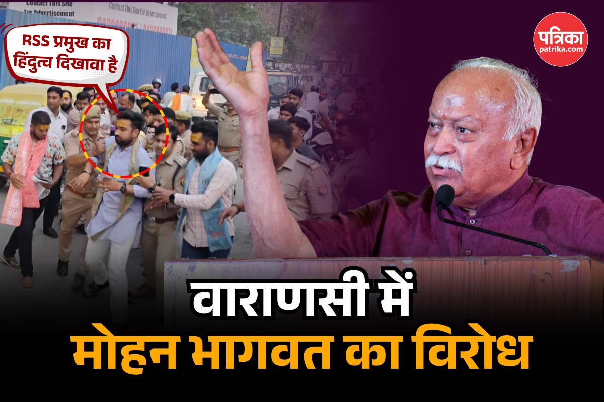 Protest against Mohan Bhagwat in Varanasi: राष्ट्रीय स्वयंसेवक संघ (RSS) के सरसंघचाल मोहन भागवत चार दिनों के लिए काशी के दौरे पर हैं। गुरुवार की शाम करीब 7 बजे जब मोहन भागवत का काफिला सिगरा चौराहे से गुजर रहा था तभी उससे पहले भारत माता मंदिर के पास NSUI के कार्यकर्ताओं ने नारेबाजी की।