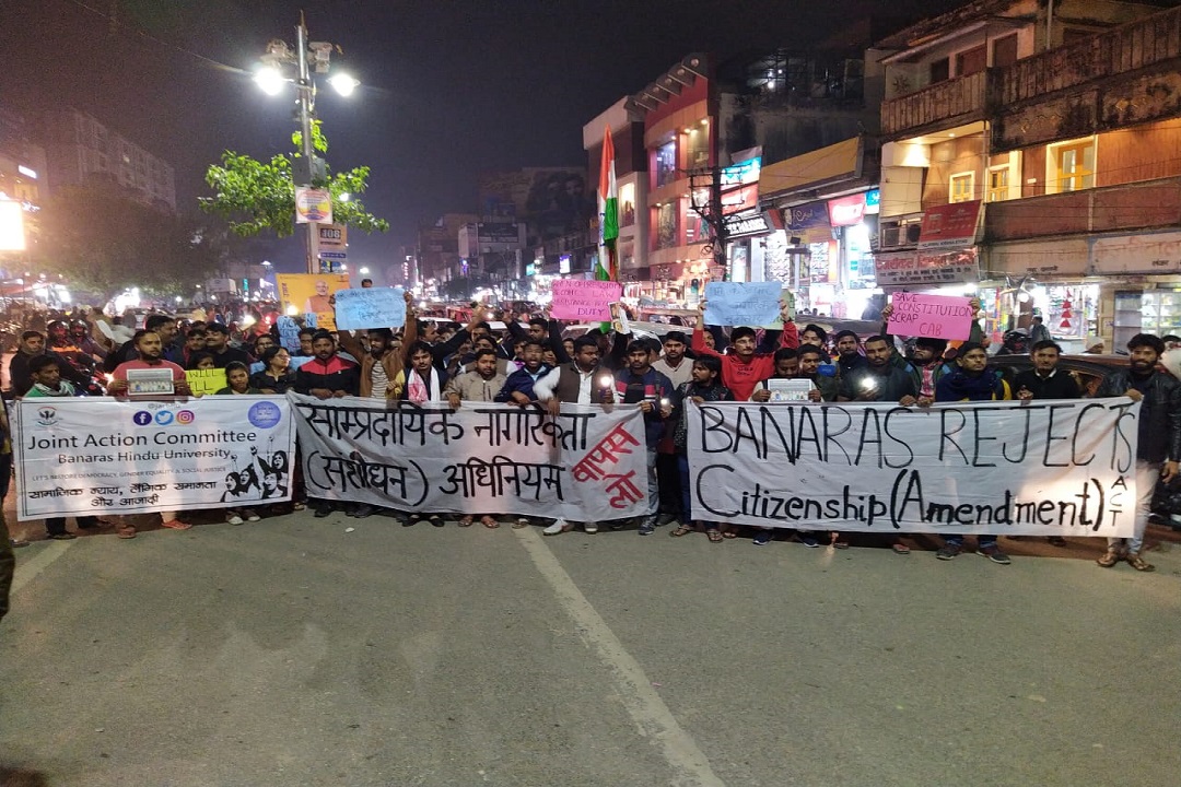 वाराणसी. नागरिकता संशोधन अधिनियं के खिलाफ बनारस में लोगों ने जिनमें बीएचयू के छात्रों, प्राध्यापकों और समाजसेवियों की तादाद ज्यादा थी ने आक्रोश व्यक्त करते हुए मशाल जुलूस निकाला। इस मौके पर लोगों ने कहा, यह संविधान के मूल भावना के खिलाफ है। लेकिन अफसोस यह कि संसद से पास होने के बाद अब यह कानून भी बन गया है। यह कानून अन्य देशों से आए शरणार्थी मुसलमानों को नागरिकता न देने के लिए बना है, जबकि भारतीय संविधान धर्म के नाम पर भेदभाव के खिलाफ है।