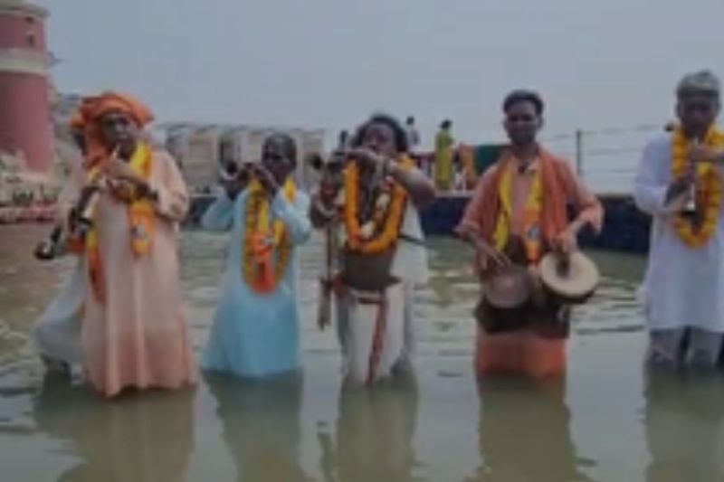 वाराणसी के तुलसी घाट पर श्री काशी विश्वनाथ मंदिर के मुख्य शहनाई वादक पंडित महेंद्र प्रसन्ना ने अपने सहयोगियों के साथ मां गंगा की गोद में खड़े होकर राग मेघ की प्रस्तुति के साथ गीत पर शहनाई की धुन बजाई।