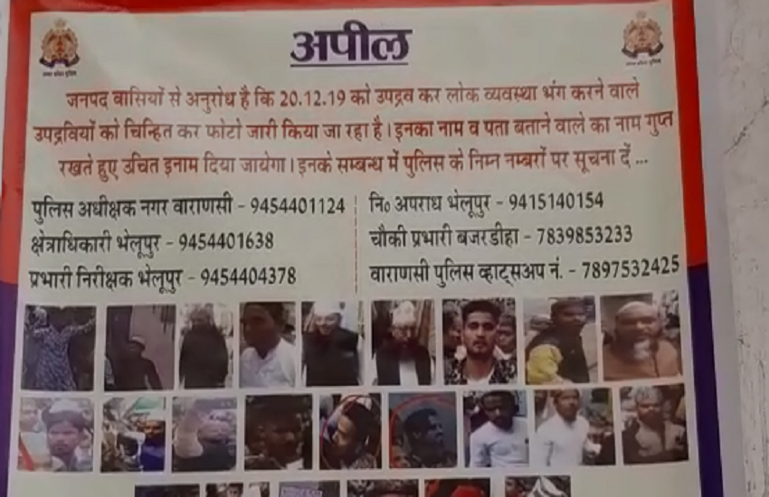 सीएए के विरोध में देश भर में हिंसा हुई थी। बनारस में पुलिस प्रशासन की मुस्तैदी की वजह से अधिक बवाल नहीं हो पाया। बजरडीजा में पथराव व लाठीचार्ज को छोड़ दिया जाये तो अन्य कोई बड़ा मामला सामने नहीं आया। एसएसपी प्रभाकर चौधरी ने बवाल करने वालों पर सख्त कार्रवाई करने की बात कही है। दर्जनों लोग गिरफ्तार किये गये हैं, जबकि हजारों लोगों के खिलाफ कैंट, भेलूपुर व दशाश्वमेध थाना में मुकदमा दर्ज है। बवाल के समय के वीडियो फुटेज व फोटो के आधार पर कई लोगों की पहचान की गयी है उनके खिलाफ भी कार्रवाई हो रह है। कुछ ऐसे लोग हैं जिनकी फोटो तो पुलिस प्रशासन के पास है लेकिन उनकी पहचान नहीं हो पायी है। ऐसे आरोपियों का पोस्टर शहर में चस्पा किया गया है ताकि उनकी पहचान हो सके। एसपी सिटी दिनेश सिंह ने बताया कि 19 व 20 दिसम्बर को बजरडीहा, कैंट व दशाश्वमेध में हुई घटना को लेकर मुकदमा दर्ज किया गया था वीडियो फुटेज व फोटो जुटाये जा रहे हैं। इसमे कुछ लोगों की पहचान हो चुकी है, जिनकी पहचान नहीं हो पायी है उनके पोस्टर जारी किये गये हैं। लोगों से अपील की गयी है कि उनकी पहचान बताये। सूचना देने वालों की पहचान गोपनीय रखी जायेगी। जिम्मेदार लोगों की पहचान हो जाने पर उनकी खिलाफ कानूनी कार्रवाई की जायेगी। यह वह लोग हैं जिन्होंने शहर की फिजा को खराब किया। भीड़ को उकसाया। उन्होंने कहा कि सूचना देने वालों को पुलिस प्रशासन इनाम भी देगा।