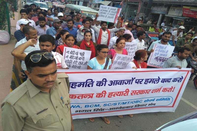विरोध मार्च में भगत सिंह-आम्बेडकर विचार मंच, एपवा ,बीसीएम और एस.सी./एस.टी./एम्.टी./ओबीसी संघर्ष समिति के कुलदीप मीणा, विनय, प्रवीण नाथ, रवीन्द्र भारतीय, अनुपम, कृष्ण कुमार, रणधीर सिंह, भुवाल यादव, सहित शिक्षक नेता अरविन्द सिंह पटेल, राजेश यादव, डा. निराला सहित विभिन्न नागरिक संगठनों के प्रतिनिधि शामिल हुए।