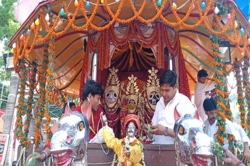 भगवान जगन्नाथ मंदिर के पुजारी राधेश्याम पांडेय के आचार्यत्व में भगवान जगन्नाथ, बहन सुभद्रा और भाई बलभद्र का लाल फूलों से श्रृंगार किया। रथ के शिखर के अलावा परिक्रमा पथ को भी भव्य सजाया गया। तड़के करीब 5.11 बजे मंगला आरती के बाद, प्रभु को नौ बजे के करीब छौंका मूंग-चना, पेड़ा, गुड़ व देशी चीनी के शर्बत का भोग लगाया गया। दोपहर 12 बजे भोग व आरती के पश्चात पट बंद कर दिया गया। फिर दोपहर बाद तीन बजे आरती के साथ पुन: दर्शन शुरू हुआ। इसके बाद आठ बजे आरती हुई। सुबह मंगला आरती के बाद रथ का स्पर्श करने और प्रभु जगन्नाथ के चरणों में तुलसी दल अर्पित करने की होड़ लगी रही। रविवार को कुछ दूरी तक रथ खींचा भी गया। अब मध्य रात्रि में 12 बजे शयन आरती होने के बाद दर्शन हेतु कपाट हो जाएगा।
