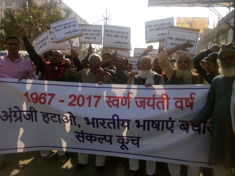वाराणसी. भारतीय भाषा को बचाने की दिशा में काशी हिंदू विश्वविद्यालय सिंह द्वार से संकल्प कूच "अंग्रेजी हटाओ ,भारतीय भाषा लाओ" ऐतिहासिक रत्नाकर पार्क पहुंची। जिसमे सैकड़ो समाजवादी और प्रबुद्धजन सम्मिलित हुए। डॉ राममनोहर लोहिया के अंग्रेजी हटाओ आंदोलन से प्रेरणा लेते हुए प्रबुद्धजन के साथ युवाओ का हुजूम भी संकल्प कूच में सम्मिलित हुआ। सन 1967 से 2017 के बीच एक लंबी अवधि के बाद अंग्रेजी हटाओ आंदोलन के बाद इसे दूसरे आंदोलन के रूप में देखा जा सकता है। अंग्रेजी हटाओ आंदोलन की स्वर्ण जयंती के अवसर पर प्रबुध्दजन काफी चिंतित दिखे। हाथों में नारो की तख्तियां देश मे भारतीय भाषाओं की दुर्गति बया कर रही थीं। संकल्प कूच रत्नाकर पार्क पहुंच कर सभा मे तब्दील हो गया।