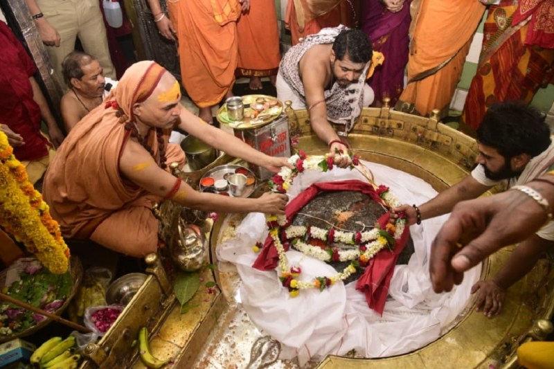 श्री गौरी केदारेश्वर मंदिर में आदि विश्वेश्वर की प्रतीकात्मक पूजा करते स्वामी अविमुक्तेश्वरानंद