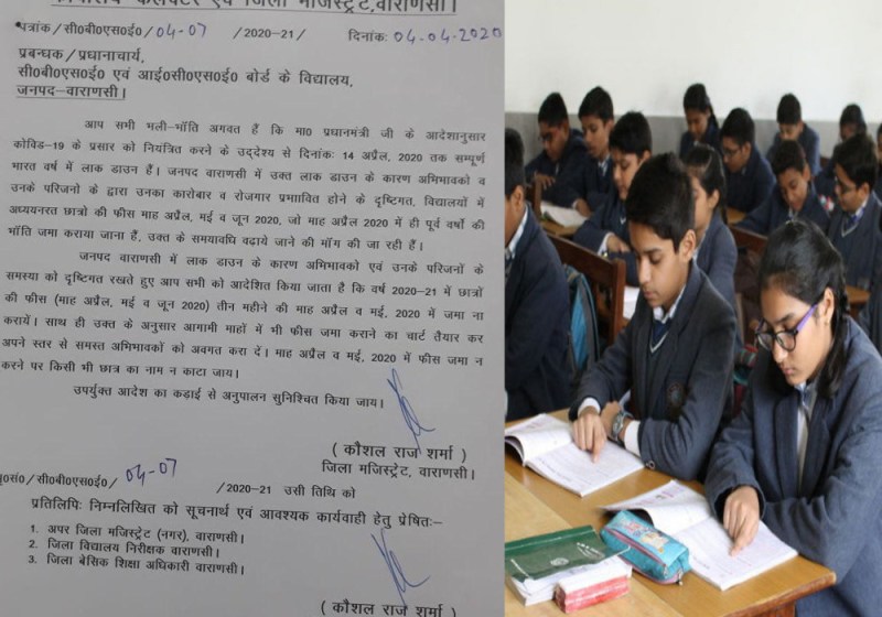 वाराणसी के जिलाधिकारी कौशल राज शर्मा ने सभी स्कूलों को निर्देश दिए हैं कि अप्रैल, मई, जून, जिसकी फीस पूर्व वर्षों की तरह अप्रैल में जमा हो जाती थी, उसकी इस वर्ष समय सीमा बढ़ा दी जाए। उन्होंने जारी पत्र में कहा है कि लॉकडाउन के कारण कारोबार व रोजगार प्रभावित है। जिस कारण उनके द्वारा स्कूलों की फीस इस दौरान भर पाना मुश्किल है। इसी के दृष्टिगत यह निर्देश सभी स्कूलों की दिए जाते हैं। उन्होंने कहा कि आगामी माह की फीस जमा करने का सभी स्कूल अपने - अपने स्तर पर चार्ट तैयार करें और अभिभावकों को इससे अवगत कराएं। अप्रैल व मई की फीस जमा न करने की स्थिति में किसी भी छात्र-छात्रा का स्कूल से नाम न काटा जाए। कानपुर नगर की जिलाधिकारी ने भी समस्त स्कूलों को यह निर्देश दिए हैं।