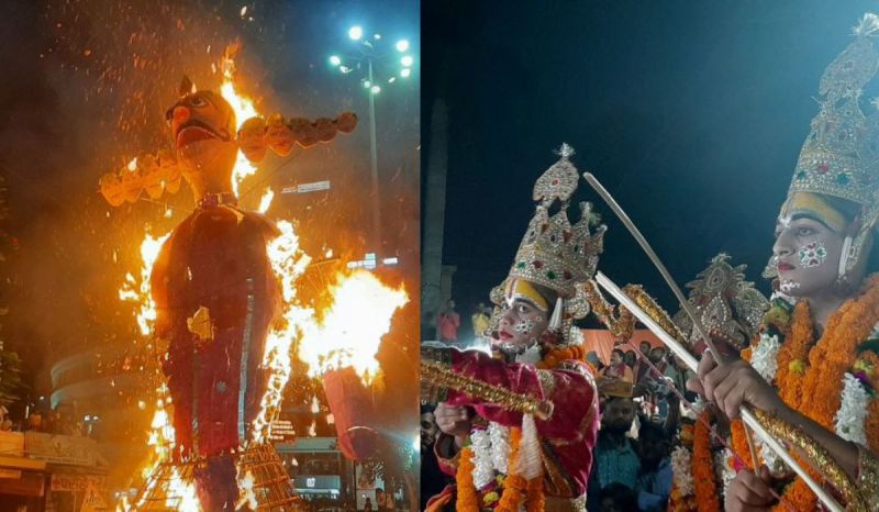 इसके पहले इंग्लिशिया लाइन चौराहे से रथ पर सवार होकर प्रभु श्रीराम, लक्ष्मण और सीता की सवारी निकली तो पूरा इलाका सियावर रामचंद्र की जय के जयघोष से गूंज उठा। तय समय भगवान हनुमान के साथ दोनों भाई मलदहिया चौराहे पर पहुंचे जहां रावण के पुतले की परिक्रमा कर उसपर बाण छोड़े और उसका संहार किया। इसके फौरन बाद राज्य मंत्री रविंद्र जायसवाल ने रावण के पुतले में आग लगाईं।