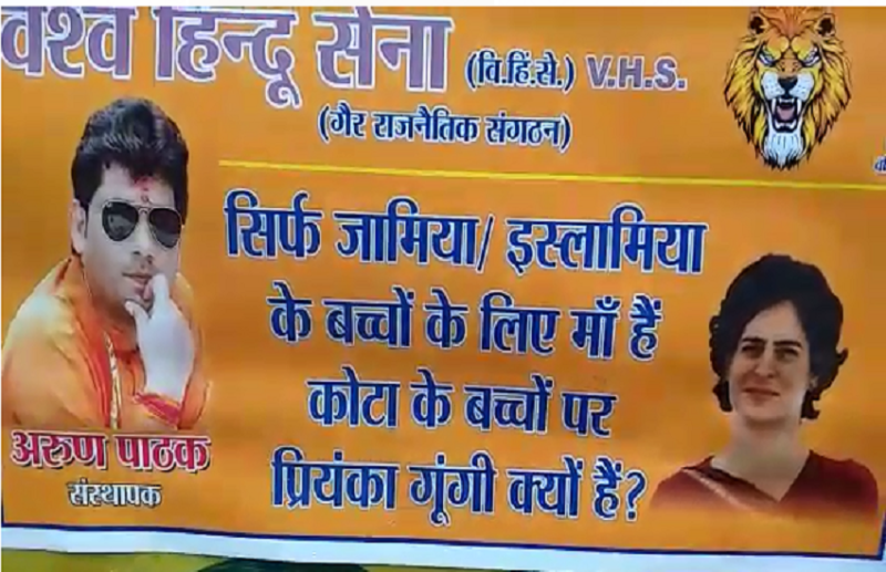 एक पोस्टर मेें लिखा है कि कोटा से दूरी आखिर क्या है मजबूरी प्रियंका गांधी वाड्रा। एक अन्य पोस्टर में लिखा गया है कि प्रियंका गांधी देश में घूम-घूम कर दंगा करने वालों के घर जाकर उनसे मुलाकत कर राजनीति कर रह है जबकि कोटा में एक सौ चार बच्चों की मौत हो चुकी है लेकिन उनके परिजनों से मिलने प्रियंका गांधी क्यों नहीं जा रही है। विश्व हिन्दू सेना के संस्थापक अरूण पाठक ने कहा कि प्रियंका गांधी, राहुल गांधी सिर्फ एक वर्ग विशेष के लोगों की बात करते हैं। उन्हें इस देश में जहर खोलने का हक नहीं है।