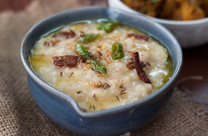 3 1/2 कप गरम पानी, नमक और हल्दी पाउडर डालकर अच्छी तरह मिला लें और 6 सिटी तक प्रैशर कुक कर लें। ढ़क्कन खोलने से पूर्व सारी भाप निकलने दें और अच्छी तरह मिला लें। लो फॅट दही के साथ तुरंत परोसें।