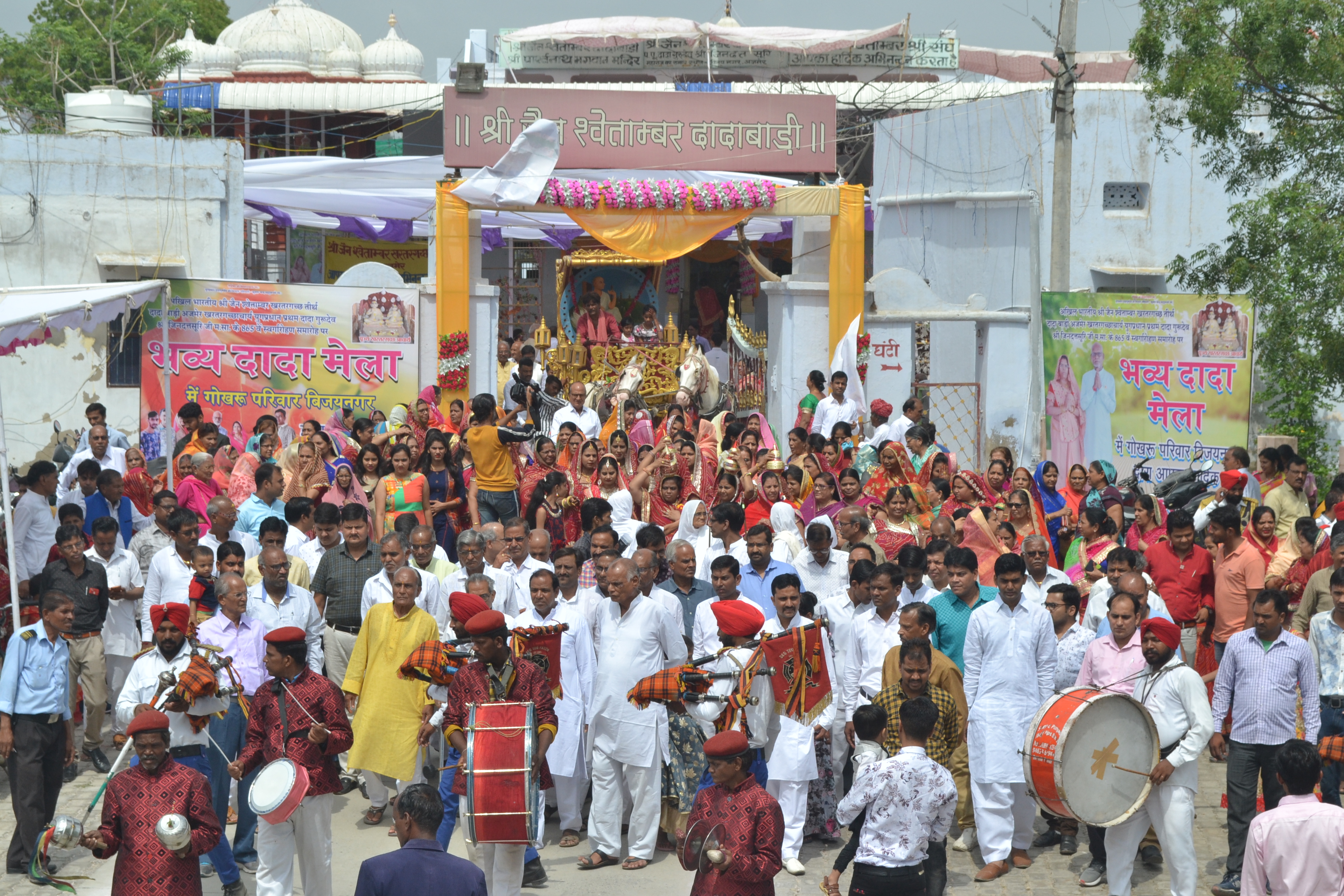 अजमेर. दादाबाड़ी मे दादा मेला की शुरु हो गई है।(procession of dada bari) इस दौरान शुक्रवार को सुबह सामुहिक भक्तामर स्त्रोत एवं दादागुरुदेव इकतीसा पाठ,सामुहिक स्स्नापूजा के बाद दादागुरुदेव की शोभा यात्रा निकाली गई। दादाबाड़ी से बैंन्डे बाजे के साथ शोभा यात्रा शुरु हुई। जिसमे साघ्वी मनोहर श्रीजी, श्रृद्वालु की भीड़ के साथ शोभायात्रा में शर्मिल हुई।(procession) कई जगह शोभायात्रा का फुलों से स्वागत किया गया। शोभायात्रा विभिन्न मार्ग से होते हुऐ दादाबाड़ी पहुंचा।