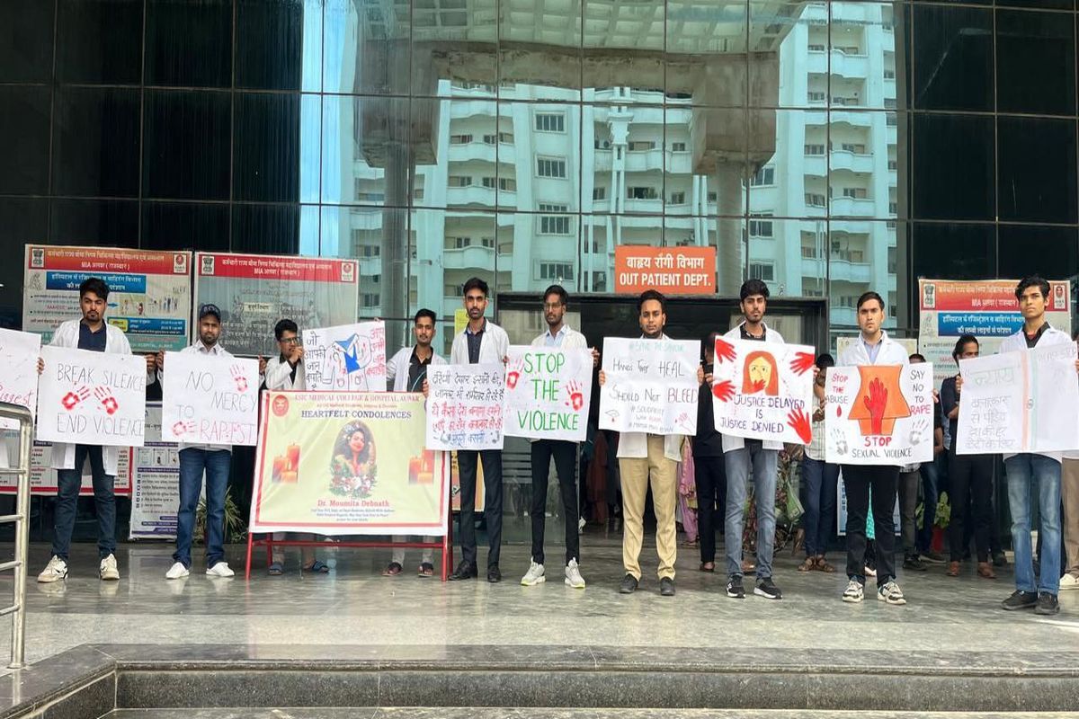 अलवर MIA स्थित ईएसआईसी मेडिकल कॉलेज के रेजिडेंट्स डॉक्टर्स ने शुक्रवार को प्रोटेस्ट किया। रेजिडेंट्स डॉक्टर्स ने कोलकाता में महिला डॉक्टर के साथ रेप और मर्डर के मामले में जल्द करवाई करने तथा दोषियों को सख्त सजा देने की भी मांग की। ईएसआई मेडिकल कॉलेज के रेजिडेंट्स डॉक्टर्स ने मुख्य गेट पर हाथों में तख्ती लेकर और बैनर-पोस्टर के साथ इस घटना की निंदा की और विरोध जताया। हालांकि, रेजिडेंट्स डॉक्टर्स के प्रोटेस्ट के कारण मरीजों को परेशानी का सामना करना पड़ा। महिला डॉक्टर के साथ रेप और मर्डर की इस घटना के बाद डॉक्टरों का रोष बढ़ाता जा रहा है।