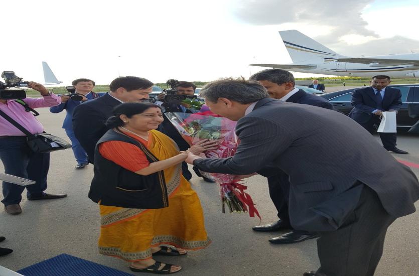 अस्ताना। केन्द्रीय विदेश मंत्री सुषमा स्वराज गुरुवार को अपने 3 देशों के दौरे के पहले चरण में कजाकस्तान की राजधानी अस्थाना पहुंचीं। अस्थाना की अपनी यात्रा के दौरान विदेश मंत्री स्वराज कज़ाखस्तान के विदेश मामलों के मंत्री कैरेट अब्द्राखमानोव के साथ द्विपक्षीय बैठक में हिंसा लेंगी। अपनी यात्रा के पहले दिन श्रीमती स्वराज ने कजाकस्तान में भारतीय समुदाय को संबोधित किया। कजाखस्तान के बाद सुषमा स्वराज किर्गिजस्तान और उजबेकिस्तान भी जाएंगी। विदेश मंत्री के रूप में यह इन देशों की उनके पहली यात्रा होगी। अपने ट्वीट में सुषमा स्वराज ने कहा कि दोनों देशों की करीबी रणनीतिक साझेदारी है और कजाखस्तान, मध्य एशिया में भारत का सबसे बड़ा व्यापार और निवेश भागीदार है।