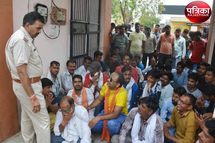बिजली निगम के लाइनमैन के साथ मारपीट के आरोप में नामजद आरोपित सरपंच के गिरफ्तार नहीं होने से खफा रावणा राजपूत समाज के लोगों ने थाने का घेराव किया तथा लोग थाने के मुख्य दरवाजे पर बैठ प्रदर्शन करने लगे।