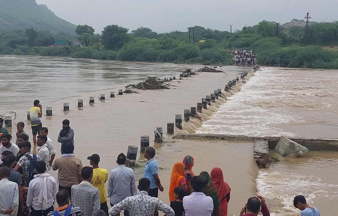 खटकड़. कस्बे के निकटमेज नदी में उफान पर आ गई है। कस्बे के समीप मेज नदी की पुलिया डूबी हुई है। यहां गुरुवार रात आठ बजे से ही आवागमन बंद है। पुलिया के दोनो ओर वाहनों की लम्बी कतार लग गई है। लाखेरी,नैनवा, के.पाटन,कोटा और बूंदी जाने वाले वाहन की लाइने लगी हुई है। जावरा रोड पर भी बारमाता मंदिर के पास सडक़ में मेज नदी का पानी आने से पंचायत क्षेत्र के बाड़ा धुंधला, गुलखेडी, भीमगंज, जावरा, जावरा की झोपडिय़ां, हरिपुरा, गुढ़ामगदू और खड़ीबारा,केसरपुरा गांवों का पंचायत मुख्यालय से संपर्क कटा।