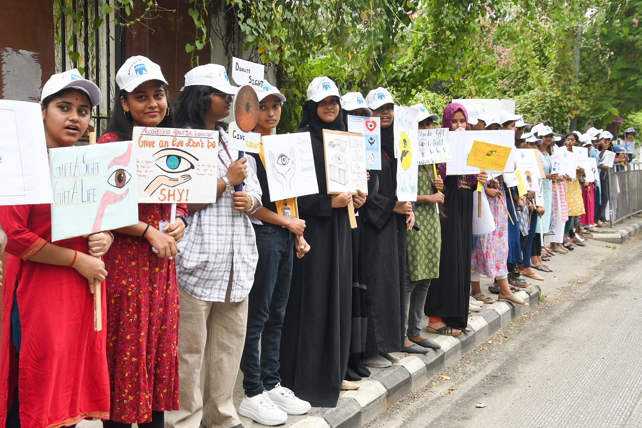 eye donation awareness : वीमेंस क्रिश्चियन कॉलेज की छात्राओं ने चेन्नई के नुंगमबाक्कम स्थित कॉलेज रोड पर नेत्रदान जागरूकता के लिए मानव श्रृंखला बनाई।