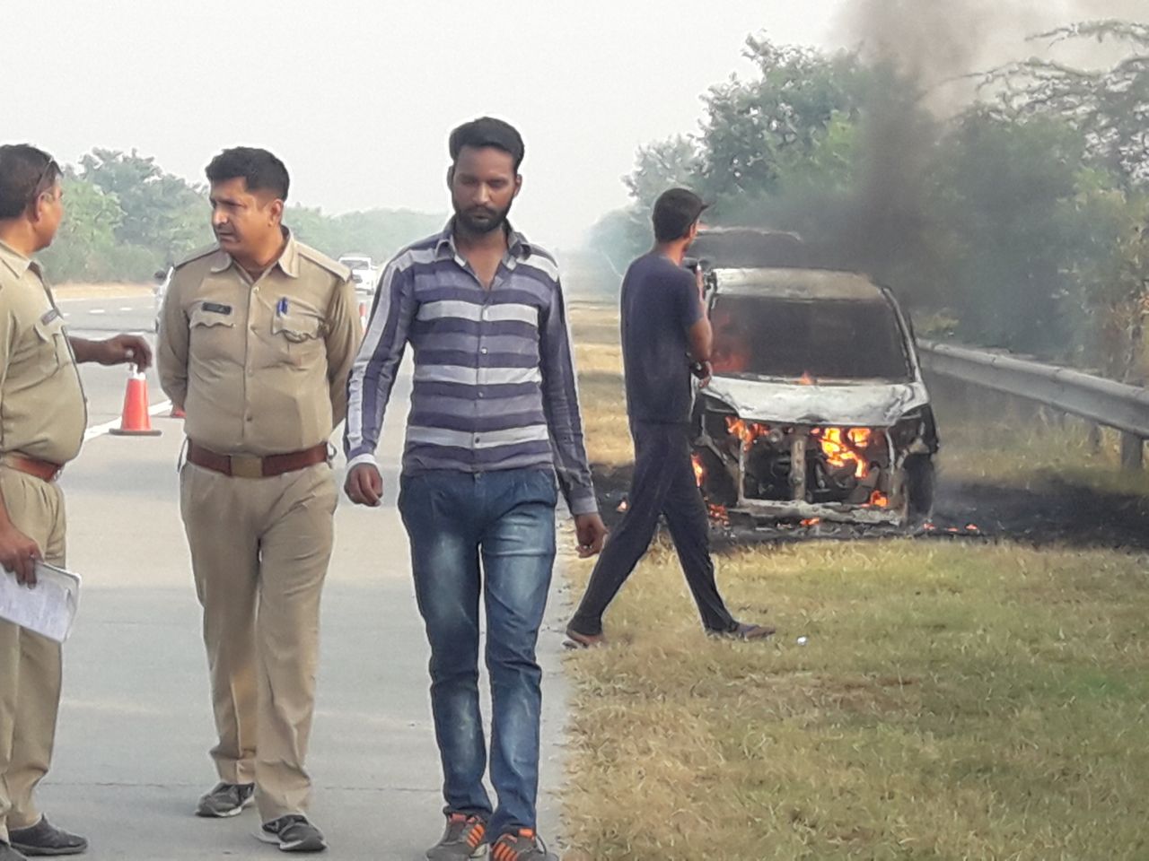 ग्रेटर नोएडा। जेवर टोल प्लाजा से करीब 10 किलोमीटर पहले शनिवार सुबह ताज हाईवे पर चलती हुई एक वैगनआर कार (नम्बर UP 80 DT 0116) अचानक आग का गोला बन गई। कार में उस वक्त जितेंद्र नामक चालक मौजूद था। आनन-फानन में चालक ने कार से कूदकर अपनी जान बचाई। कार चालक जितेंद्र ने बताया कि वह अपनी कार ओला में चलाता है। वह गुरुग्राम से सवारी छोड़कर अपने घर की तरफ एटा जा रहा था। इस बीच अचानक गाड़ी में शॉर्ट सर्किट के कारण भीषण आग लग गई। मौके पर पहुंची पुलिस और अन्य लोगों ने गाड़ी में लगी आग को काफी बुझाने का प्रयास किया लेकिन तब तक गाड़ी काफी जल गई।