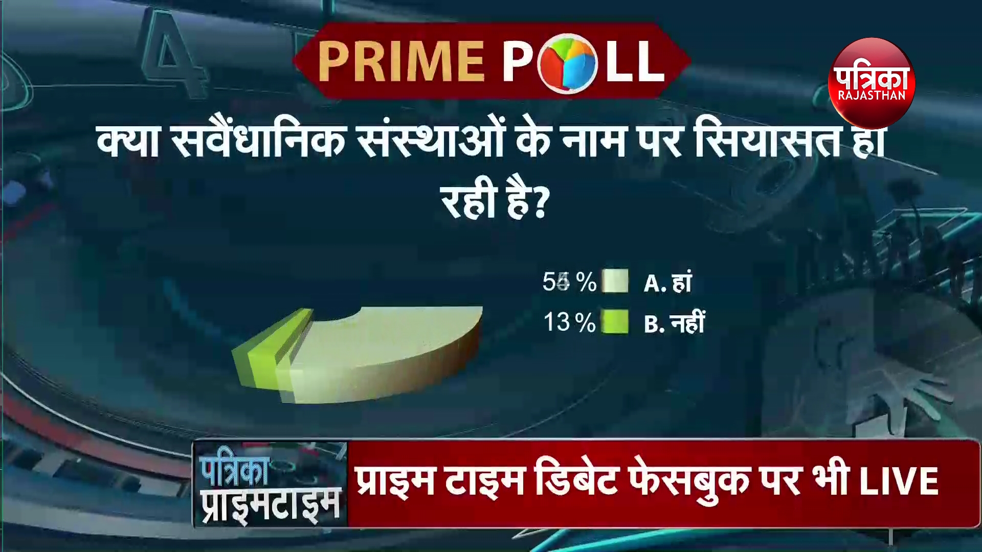 प्राइम टाइम डिबेट के सोशल मीडिया में हुए प्राइम पोल के जरिए वोट करने वाले लोगों में 81 प्रतिशत लोगों का मानना है कि देश में सवैंधानिक संस्थाओं के नाम पर सियासत हो रही है. वही 19 प्रतिशत लोगों का ऐसा नहीं मानना है.