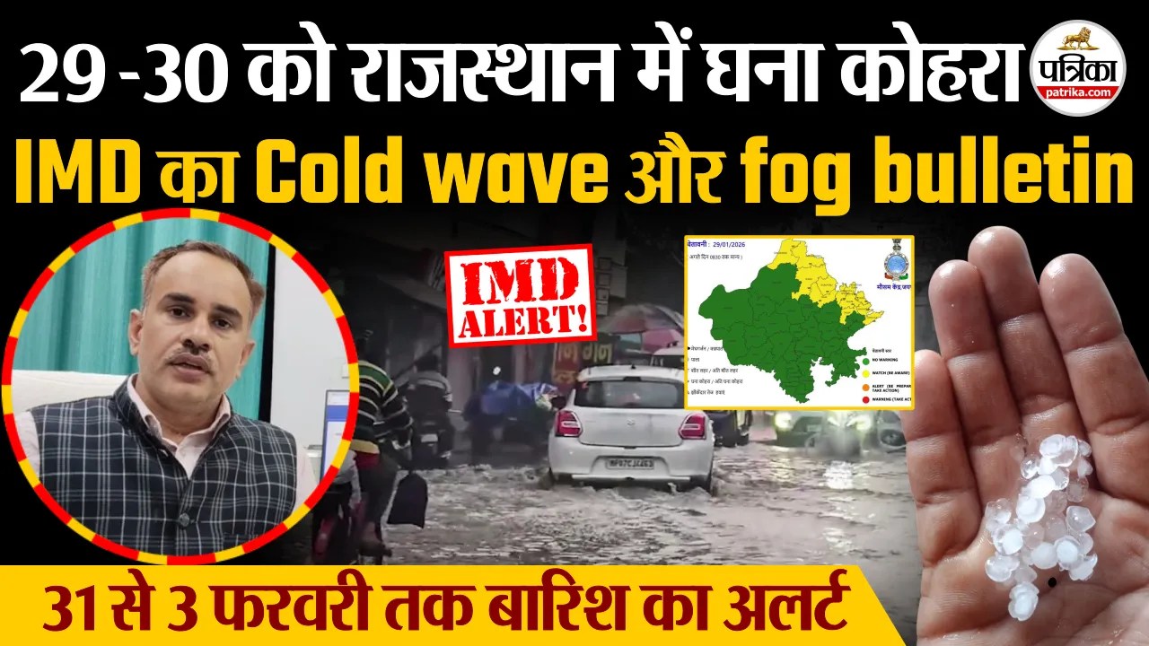 Weather Update Today: मौसम विज्ञान केंद्र जयपुर के कोल्ड वेव और फोग बुलेटिन cold wave and fog bulletin में 29-30 जनवरी को Alwar, Bharatpur, Dausa, Deeg, Dholpur, Jhunjhunu, Khairthal-Tijara अलवर, भरतपुर, दौसा, डीग, धौलपुर, झुंझुनूं, खैरथल-तिजारा, कोटपुतली-बहरोड़, सीकर, चूरू, हनुमानगढ़, श्रीगंगानगर में सुबह के वक्त घना कोहरे का अलर्ट alert जारी किया गया है। 31 जनवरी और 1 फरवरी को अलवर, भरतपुर, दौसा, डीग, धौलपुर, झुंझुनूं, करौली, खैरथल तिजारा,कोटपुतली-बहरोड़, सीकर,चूरू, हनुमानगढ़ में कहीं कहीं मेघगर्जन के साथ वज्रपात की चेतावनी भी जारी की है।