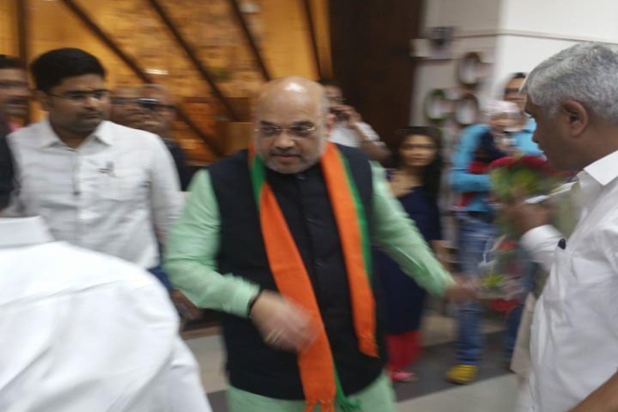 जोधपुर. भाजपा के राष्ट्रीय अध्यक्ष अमित शाह एक दिवसीय दौरे पर रविवार को पाली और जोधपुर पहुंचे हैं। पाली में दो और जोधपुर शहर में प्रस्तावित तीन प्रमुख कार्यक्रमों में हिस्सा लेने के साथ ही वे मसूरिया मंदिर में बाबा रामदेव के गुरु बालीनाथ के दर्शन-पूजन करेंगे। साथ ही एक कार्यकर्ता के निवास पर शाम को भोजन भी करेंगे। दोपहर बारह बजे जोधपुर एयरपोर्ट पहुंचे अमित शाह का स्वागत करने के लिए केंद्रीय कृषि राज्य मंत्री व सांसद गजेंद्र सिंह शेखावत, महापौर घनश्याम ओझा, शंभू सिंह खेतासर, सांसद नारायण पंचारिया, जिला अध्यक्ष देवेंद्र जोशी आदि ने एयरपोर्ट में पहुंचकर स्वागत किया। विशेष विमान से एयरपोर्ट पहुंचने के बाद अमित शाह ने जोधपुर के भाजपा नेताओं के साथ चर्चा की और उनके साथ नाश्ता भी किया। नाश्ते में अमित शाह ने घी की कचौरी और शहर के प्रसिद्ध लड्डू खाए। शाह एयरपोर्ट से ही सीधे हेलीकॉप्टर के माध्यम से पाली के लिए रवाना हो गए। शाह का पाली शहर में करीब तीन घंटे तक दो कार्यक्रमों में हिस्सा लेने और इसके बाद जोधपुर शहर में करीब 5 घंटे का प्रवास प्रस्तावित है। इन पांच घंटों में वे तीन कार्यक्रमों को संबोधित करेंगे। शाह का जोधपुर दौरा पूर्ण रूप से कार्यकर्ता केन्द्रित किया गया है। फिलहाल वे आमसभा को संबोधित करने से परहेज कर रहे हैं। मारवाड़ में चुनावी रणनीति के साथ ही नाराज नेताओं व कार्यकर्ताओं को मनाने का मंत्र भी देंगे।