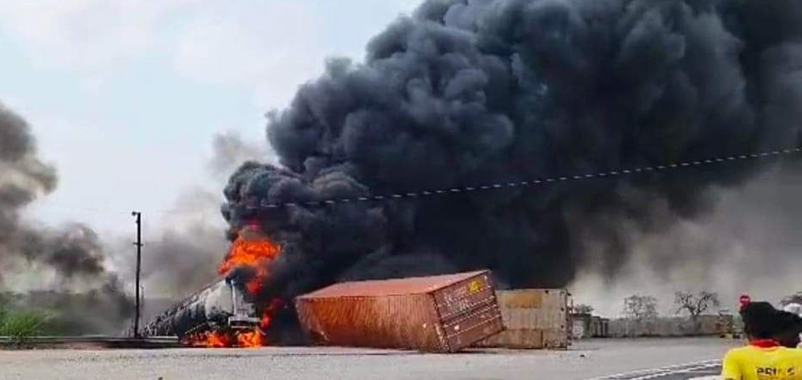 जिले में देचू थानान्तर्गत एनएच-125 व मेगा हाइवे पर बावकान तिराहे के पास गुरुवार अपराह्न ट्रेलर कंटेनर व फ्यूल से भरे टैंकर में भिड़ंत के बाद भीषण आग लग गई। (Burning tanker & trailor) दोनों के चालक जिंदा जल गए। एक चालक का शव निकाला गया है, लेकिन टैंकर चालक का शव निकालने के प्रयास किए जा रहे हैं। (2 Driver burnt alive)