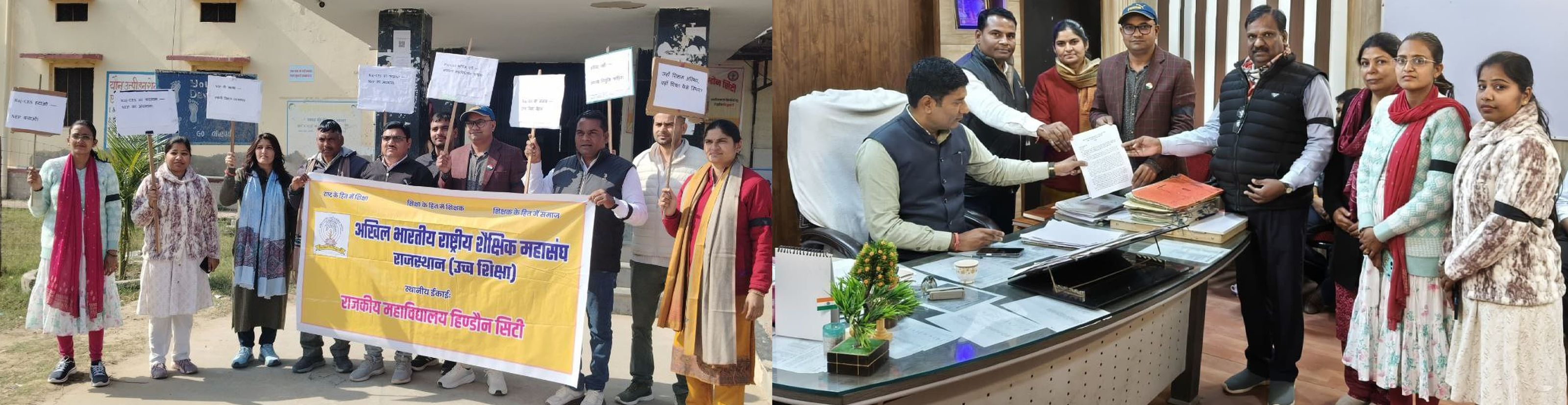 हिण्डौनसिटी. अखिल भारतीय राष्ट्रीय शैक्षिक महासंघ, राजस्थान (उच्च शिक्षा) की राजकीय महाविद्यालय इकाई ने बुधवार को राजसेस महाविद्यालयों की वर्तमान संकल्पना और संचालन व्यवस्था के विरोध में प्रदर्शन किया। प्राध्यापकों ने महाविद्यालय के मुख्य द्वार पर काली पट्टी बांधकर और मांगों से संबंधित तख्तियां लेकर सरकार की नीतियों के खिलाफ विरोध दर्ज कराया। बाद में उपखंड अधिकारी कार्यालय पहुंच का एसडीएम हेमराज गुर्जर को मुख्यमंत्री के नाम ज्ञापन सौंपा।