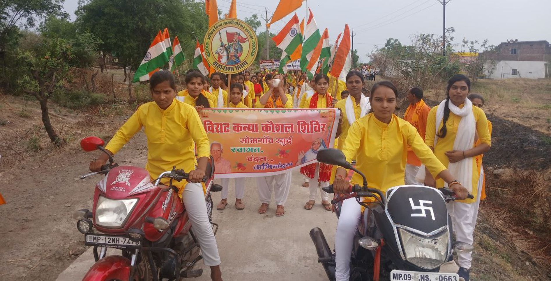 पितांबरी वस्त्रों में बाइक पर सवार देवकन्याएं, हाथों में तिरंगा थामें, वीरांगना रूप में जीप पर सवार कन्याएं, शंखनाद करते हुए जय घोष के साथ निकली। नजारा था अखिल विश्व गायत्री परिवार के तत्वावधान में हो रहे विराट कन्या कौशल शिविर के शुभारंभ का। शुक्रवार को किल्लौद ब्लॉक के ग्राम सोमगांव में तीन दिवसीय शिविर का शुभारंभ कलश यात्रा से हुआ। आयोजन में चार जिलों से 108 चेतना केंद्र के 540 गांव से गायत्री परिजन शामिल हुए।
