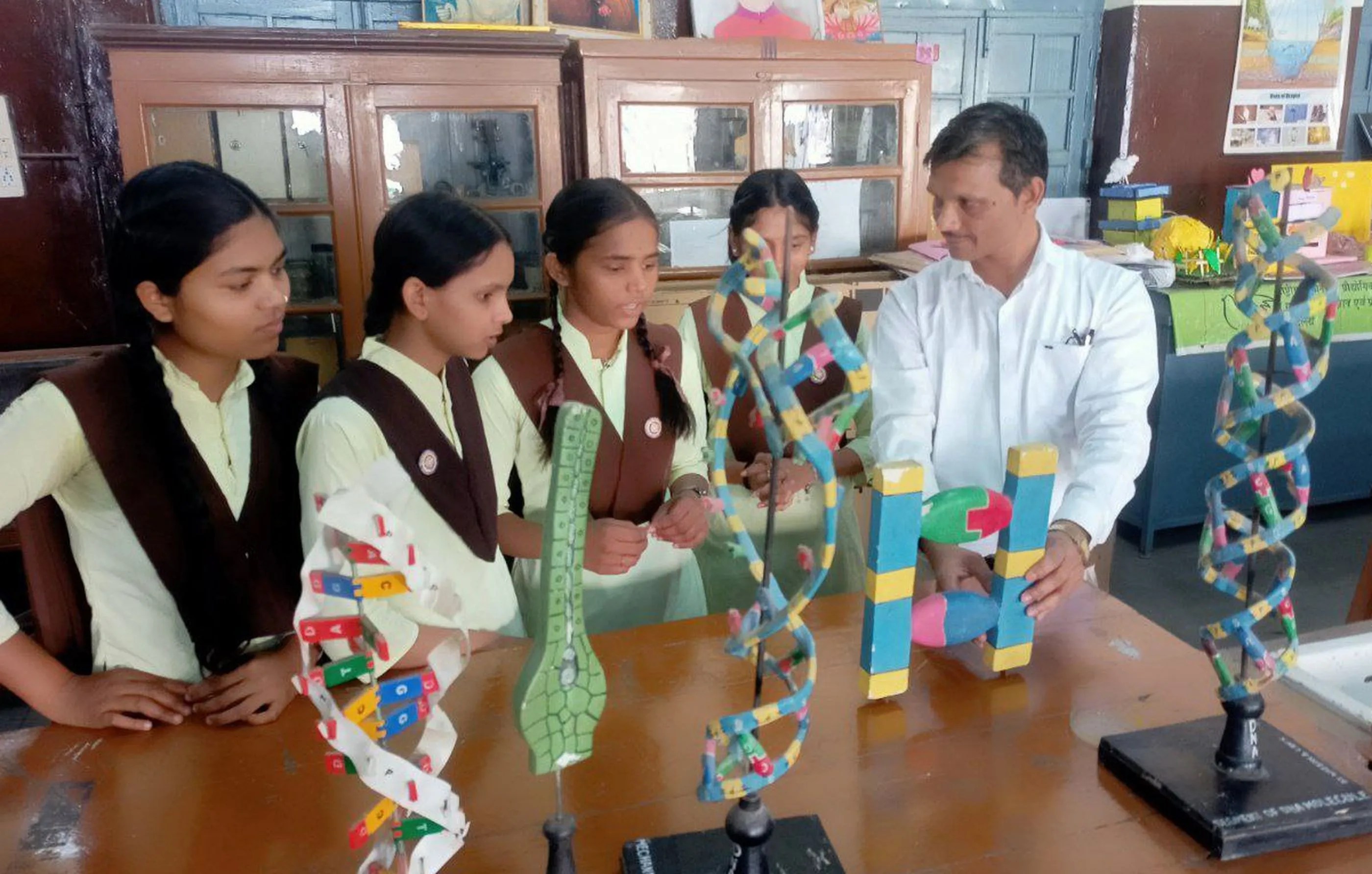जीव विज्ञान की प्रयोगशाला में जीवों की संरचनाओं को समझने के लिए छात्र प्रैक्टिकल कर रहे हैं। विषय विशेषज्ञ भरत भूषण गाठिया छात्रों को पीओपी के डीएनए मॉडल से छात्रों को समझाया कि एक पीढ़ी से दूसरी पीढ़ी तक अनुवांशिक सूचनाएं डीएन के माध्य से पहुंचती हैं। इस दौरान उन्होंने मानव संरचना में सिकल सेल के मरीजों का उदाहरण दिया।