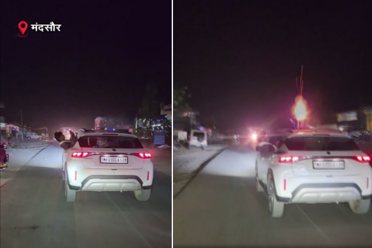 Reels craze: मंदसौर जिले में दिवाली की रात का एक वीडियो वायरल हो रहा है जिसमें तेज रफ्तार एक कार की छत पर रखकर पटाखे फोड़े जा रहे थे। रील बनाने के लिए एक युवक खतरनाक स्टंट कर रहा था। कार नंबर MP09 DC 8139 की छत पर पटाखे जलाए जा रहे थे। कुछ युवक बाइक से कार के आगे-पीछे चल रहे थे और वीडियो बना रहे थे।