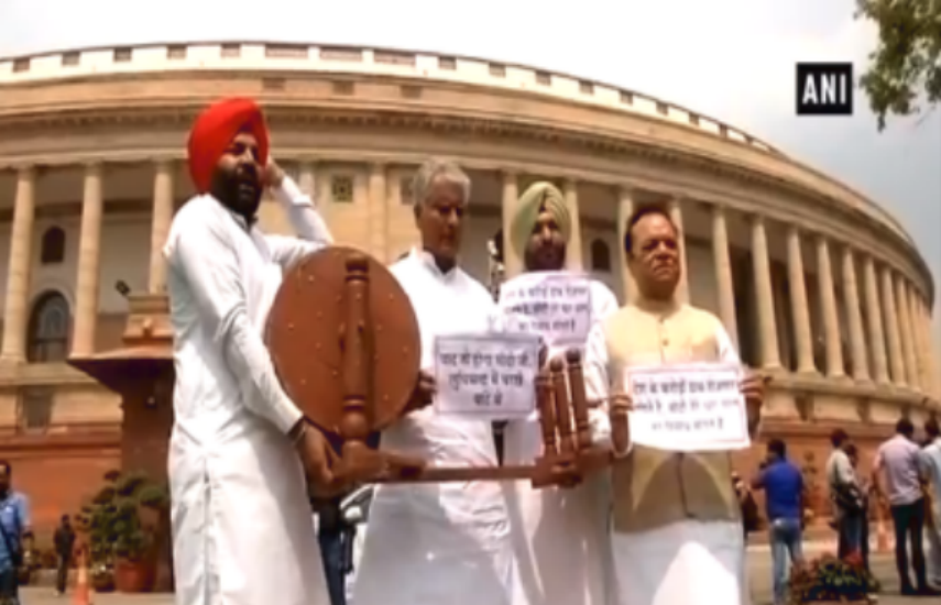 नई दिल्ली। मानसून सत्र के दौरान सोमवार को पंजाब के कांग्रेस सांसदों ने संसद के सामने बेरोजगारी पर विरोध प्रदर्शन किया। इस दौरान उन्होंने कहा कि सरकार ने युवाओं को ठगा है। हर साल दो करोड़ नौकरी देेने के वादे को सरकार ने पूरा नहीं किया है। सांसदों ने इस दौरान हाथ में तख्ती ली हुई थी। इस पर उन्होंने अपनी मांगों को लेकर नारे भी लगाए।