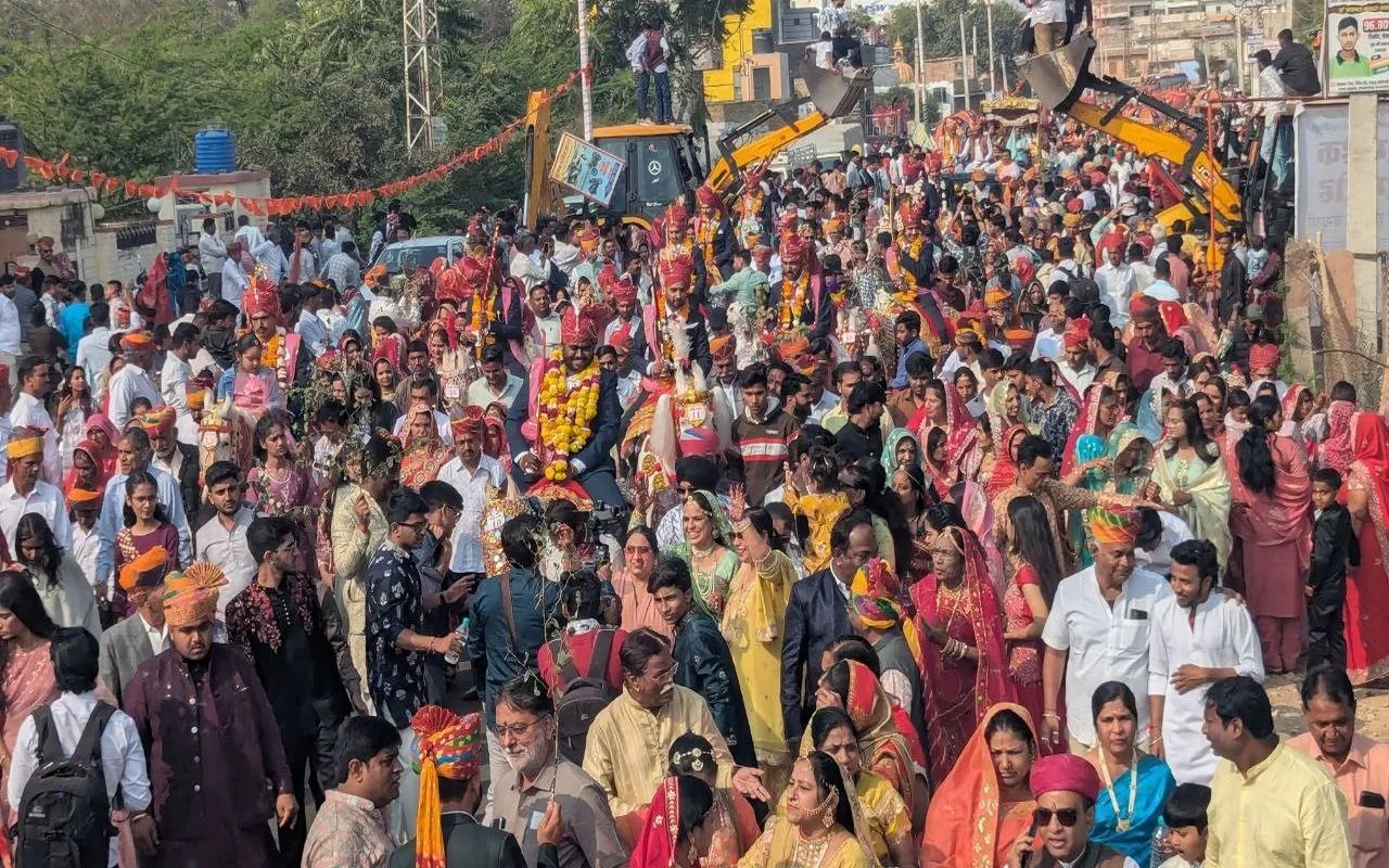 नागौर. सैनिक क्षत्रिय माली संस्थान की ओर से गुरुवार को हुए पंचम सामूहिक विवाह समारोह वैदिक मंत्रों के साथ 70 जोड़े विधिवत वैवाहिक बंधन में बंधे। सुबह 9 बजे माली संस्थान हनुमान बाग से 70 वर राजाओं की सामूहिक बारात एक साथ रवाना हुई। सजे-धजे परिधान में वरराजा खुली जीपों व बग्गियों में सवार होकर बैंड-बाजों की धुन पर निकले। पूरे मार्ग पर बारात का पुष्प वर्षा से स्वागत होता रहा। बारात चुंगी नाका, पंवारों का बास, बडक़ी बस्ती, जगावता मोहल्ला और सांखला बस्ती से होते हुए गुजरी। इन रास्तों पर फूलों की बारिश होती रही। कई स्थानों पर स्टेज बनाकर और जेसीबी पर खड़े होकर गुलाब की पंखुडिय़ों से बारात का स्वागत किया गया। भारत माता की जय और संत शिरोमणि लिखमीदास महाराज के जयघोष से वातावरण गूंजता रहा।