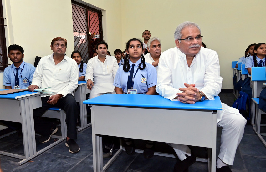 रायपुर. मुख्यमंत्री भूपेश बघेल आज दुर्ग के स्वामी आत्मानंद अंग्रेजी माध्यम स्कूल में करीब 45 बरस बाद एक बार फिर दसवीं के छात्र बने। स्कूल के नवनिर्मित स्मार्ट क्लास रुम में छात्राओं के बीच बैठकर उन्होंने वनमंत्री मोहम्मद अकबर, दुर्ग शहर के विधायक अरूण वोरा और महापौर धीरज बाकलीवाल के साथ रसायन शास्त्र की क्लास अटेंड की। दसवीं की छात्रा भूमिका यादव ने ‘केमिकल बॉन्ड’ वाला चैप्टर पढ़ाया। मुख्यमंत्री श्री बघेल सहित कक्षा के सभी विद्यार्थियों को उसने ‘ऑक्टेव रुल’ सिखाया। इस बार मुख्यमंत्री अंग्रेजी माध्यम में पढ़े। दुर्ग के दीपक नगर के स्वामी आत्मानंद अंग्रेजी माध्यम स्कूल में आज यह नजारा दिखा। भेंट-मुलाकात के लिए दुर्ग पहुंचे मुख्यमंत्री भूपेश बघेल ने आज इस स्कूल के नवनिर्मित भवन का भी लोकार्पण किया।