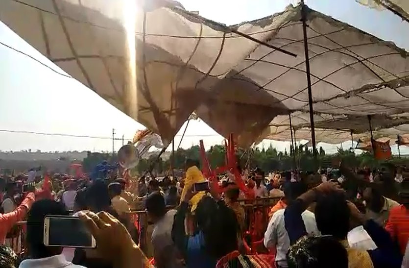 अमित शाह की सभा बापू की कुटिया के समीप आयोजित थी, यहां लगाया टेंट अचानक तेज हवा चलने के कारण उखड़ गया।