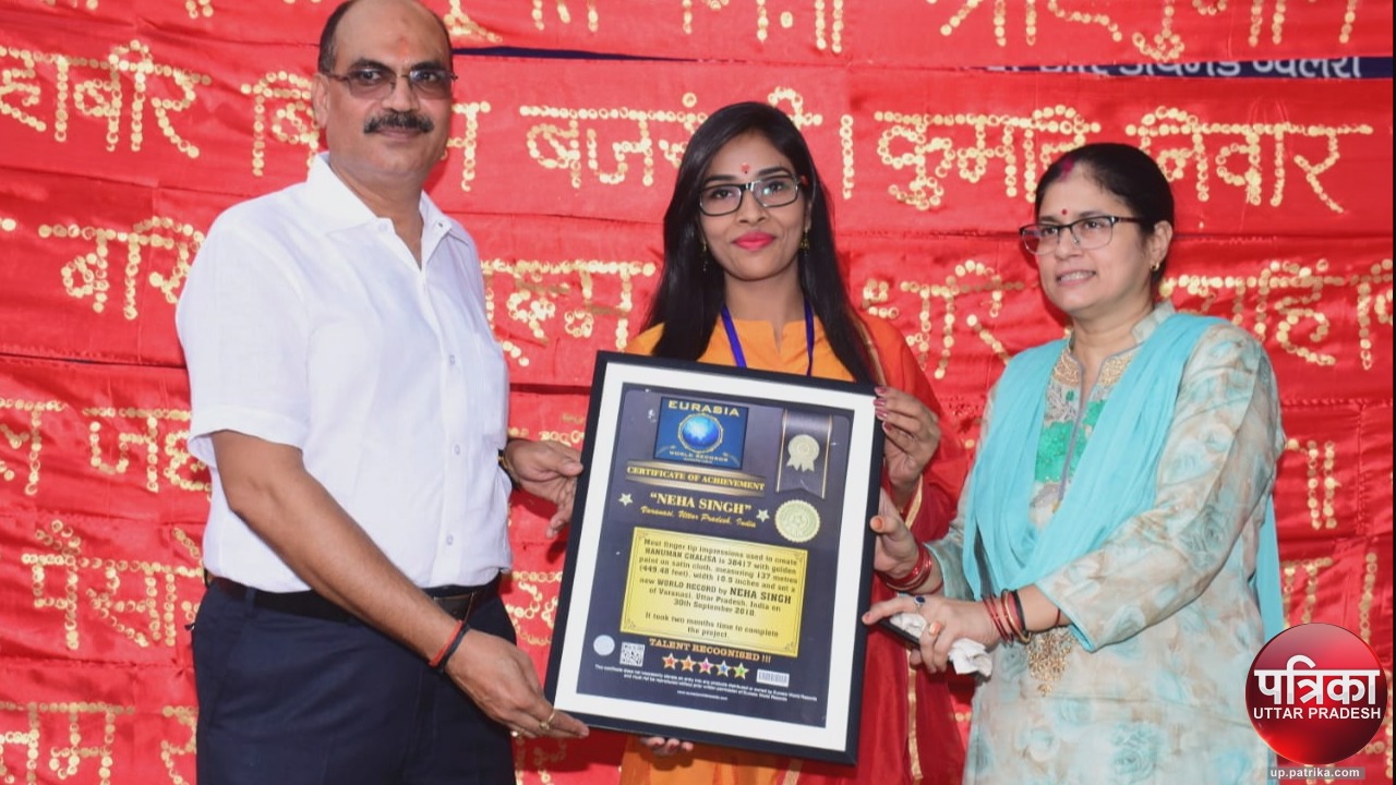विद्यापीठ की छात्रा नेहा सिंह ने अंगुलियों के निशान बना बना कर पूरी हनुमान चालीसा लिख दी है। नेहा ने 38417 उंगलियों के निशान से 137 मीटर के कपड़े पर यह हनुमान चालीसा लिखी है। नेहा सिंह द्वारा उंगलियों के निशान से लिखी गई हनुमान चालीसा का विमोचन सोमवार को संकट मोचन मंदिर में पद्मश्री डॉ. सरोज चूड़ामणि एवं वाणिज्य कर उप आयुक्त राकेश सिंह ने किया। साथ ही यूरेशिया वर्ल्ड रिकॉर्ड के प्रतिनिधि के रूप में काशी के नाम 4 बार गिनीज बुक ऑफ वर्ल्ड रिकॉर्ड में अपना नाम दर्ज कराने वाले जगदीश पिल्लई की मौजूदगी में नेहा सिंह को यूरेशिया वर्ल्ड रिकॉर्ड का प्रमाणपत्र भी दिया गया। साथ ही यूरेशिया वर्ल्ड रिकॉर्ड का मेडल व अमेरिकी राष्ट्रपति डोनाल्ड ट्रम्प के का चेहरा अंकित किया हुआ स्वर्ण सिक्का भी नेहा को प्रदान कर सम्मानित किया गया। इसके अलावा शहर के कई गणमान्य लोगों ने उसे बधाई के साथ लगभग 50 हजार रुपये सहायता राशि व कई तरह के उपहार प्रदान किए।