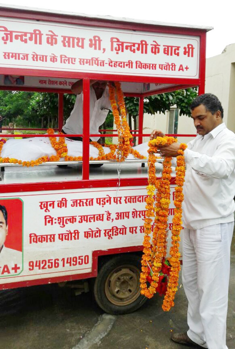 अपनों को खो देने के दुख में परिजन जब शव को दुर्घटनास्थल, अस्पताल से घर या फिर घर से मुक्तिधाम तक पहुंचाने के लिए परेशान रहते हैं तो अब उन्हें एक ही नाम याद आता है विकास पचौरी का। सभी अस्पतालों, चौराहों और प्रमुख स्थानों पर विकास के होर्डिंग में निशुल्क शव वाहन और उनके मोबाइल नंबर का जिक्र है। वे सूचना मिलते ही तत्काल मौके पर पहुंचते हैं और शव को अपने वाहन में रखकर रामधुन बजाते हुए खुद वाहन ड्राइव कर चल पड़ते हैं मुक्तिधाम तक। इसके बदले वे मृतक के परिजनों से कोई शुल्क नहीं लेते।