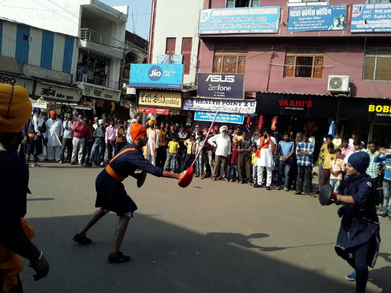 रास्ते भर अखाड़े के युवाओं और युवतियों ने तलवार, फर्से, लाठियों और गोलों से करतब दिखाए। उधर बैंड का निर्देशन और उस पर कदमताल करते बैंड के साथियों की लय शानदार थी। ढोल को हवा में उछालकर बजाने और उसे दांतों से दबाकर चलने का अंदाज सबको पसंद आया। समाज के लोगों द्वारा रास्ते भर प्रसादी बांटी जा रही थी। शहर के प्रमुख मार्गों से होती हुई यह शोभायात्रा वापस गुरूद्वारे पर संपन्न हुई, जहां लंगर का आयोजन हुआ।