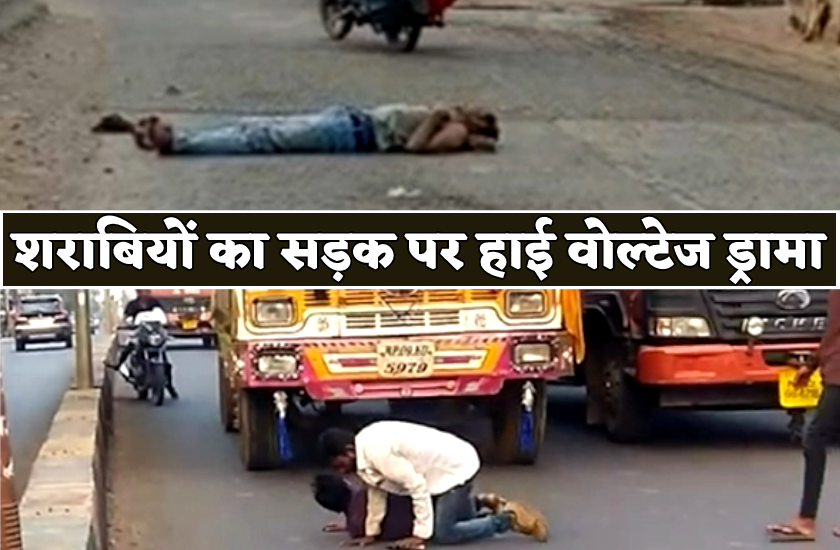 नशे में धुत शराबियों का ड्रामा : बीच सड़क पर एक-दूसरे को उठाते फिर गिर जाते, वीडियो वायरल