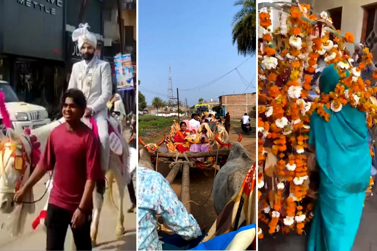 Unique Wedding Procession : आज के 'शो-ऑफ' वाले दौर में, जहां लाखों रुपए डीजे, आतिशबाजी सहित अन्य दिखावे पर खर्च होते हैं, वहां मध्य प्रदेश के विदिशा जिले के सिरोंज में बैलगाड़ियों पर निकाली ने एक अनोखी बारात ने एक बार फिर 80 के दशक की याद ताजा कर दी। छोटे साउंड सिस्टम पर बजते पुराने गीत 'कौन दिशा में लेके चला रे बटोहिया' ने माहौल को भावनात्मक बना दिया। बिना शोर-शराबे और धुएं के ये बारात पर्यावरण संरक्षण का एक मूक संदेश दे गई।