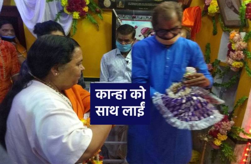 उमा भारती अपने साथ कृष्णजी की मूर्ति भी साथ लाई थीं। उन्होंने मंदिर में राधाजी के समीप ही कृष्णजी की प्रतिमा रखकर पूजा-अर्चना की। उन्होंने बताया कि वे आज राधा अष्टमी के मौके पर श्रीकृष्ण को राधा जी से मिलाने लाई हैं। 1 घंटे तक मंदिर में उन्होंने बधाई गीत गाए, राधा और कृष्ण का एक साथ दर्शन करने के बाद उन्होंने आरती की।
