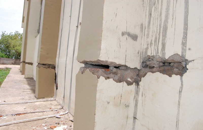 जमीन से सटकर ही दीवार में करीब आधा फीट मोटी लम्बी-लम्बी दरारें आ गई हैं। कुछ दरारों को तो सीमेंट-बजरी का मसाला लगाकर ढंकने का प्रयास किया गया है। वहीं वहीं कुछ दरारें इतनी मोटी हैं कि मसाला लगने के बाद भी वे दोबारा दिखने लगीं हैं। वहीं आधा दर्जन से अधिक पिलर भी जमीन में नीचे इतने धस गए हैं कि बीच में मोटी-मोटी दरारें आ गईं हैं।